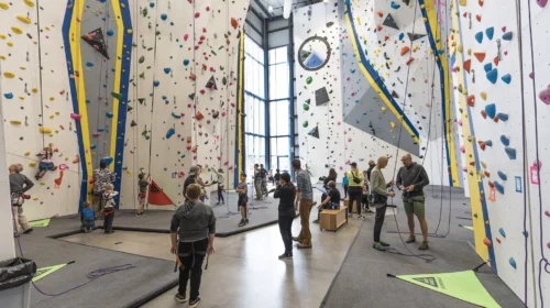 The Green Bay location occupies a 1,115 sqm (12,000 sq.ft) building with approximately 929 sqm (10,000 sq.ft) of climbing surface and over 40 rope belay lines, creating a dynamic and varied climbing environment. The wall design follows Odyssey’s clean white, grey, blue, and yellow palette, now a defining aesthetic for the brand.